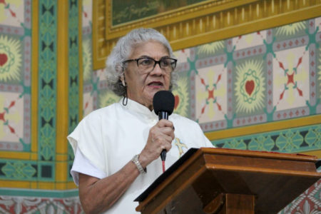 Na sequência, Padre Omar convidou Wilsa para dirigir algumas palavras aos presentes. Ela compartilhou sua experiência como integrante da comitiva que foi a Portugal e ressaltou a importância do catolicismo em sua etnia e da convivência harmoniosa entre as tradições indígenas e a fé cristã, colocando a cruz como símbolo de união entre povos.
