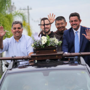 Representando a fraternidade do Santuário Frei Galvão, Frei Diego Melo, reitor, e Frei Roberto Ishara foram receber a carreata vinda do Santuário Nacional de Aparecida, na divisa entre os municípios. Com solenidade, o cortejo percorreu as ruas de Guaratinguetá, em direção ao Santuário Frei Galvão, onde os fiéis esperavam com grande devoção.