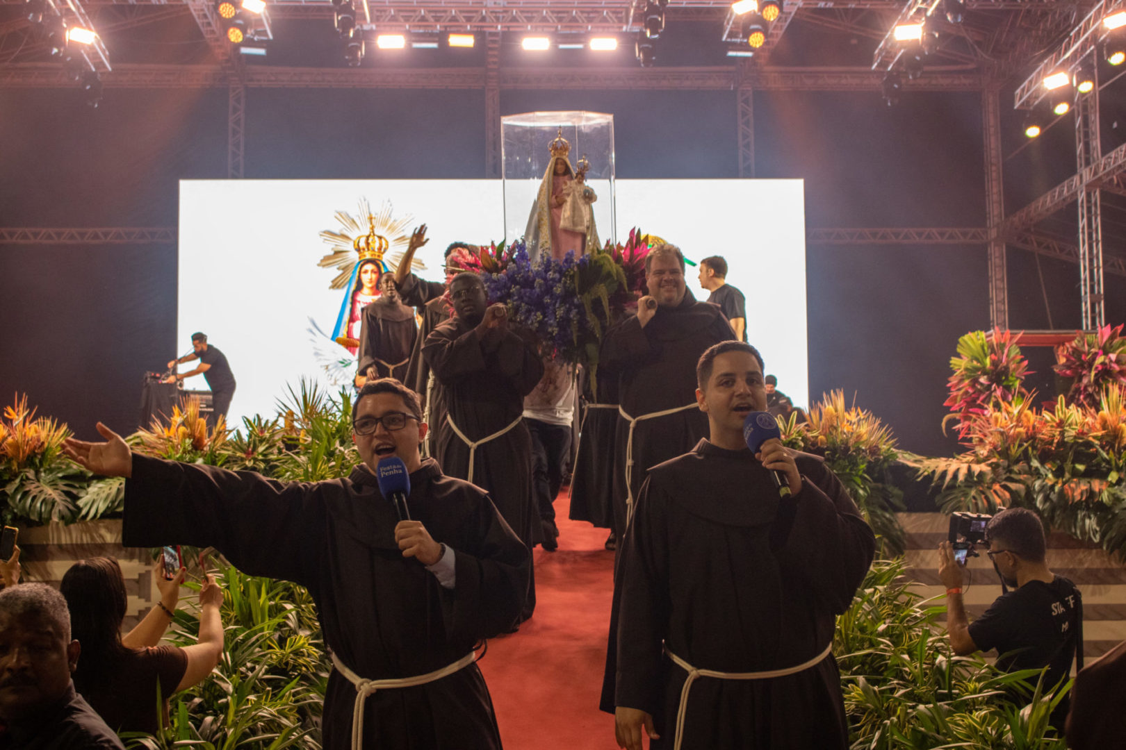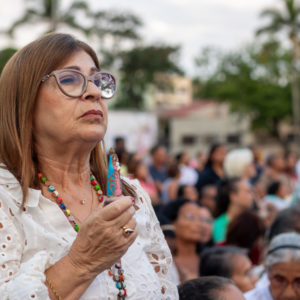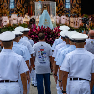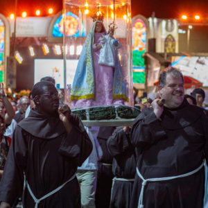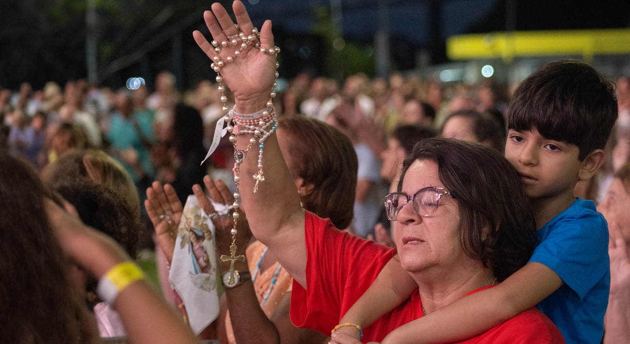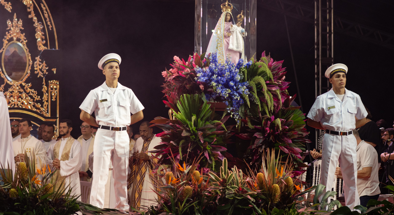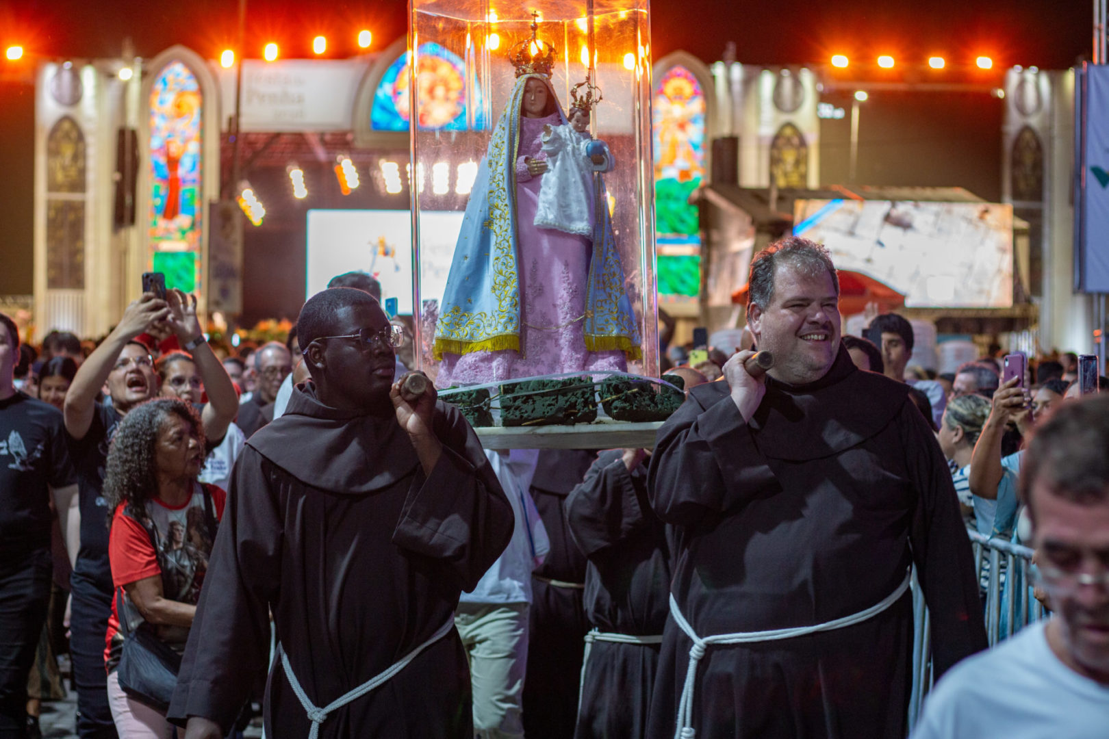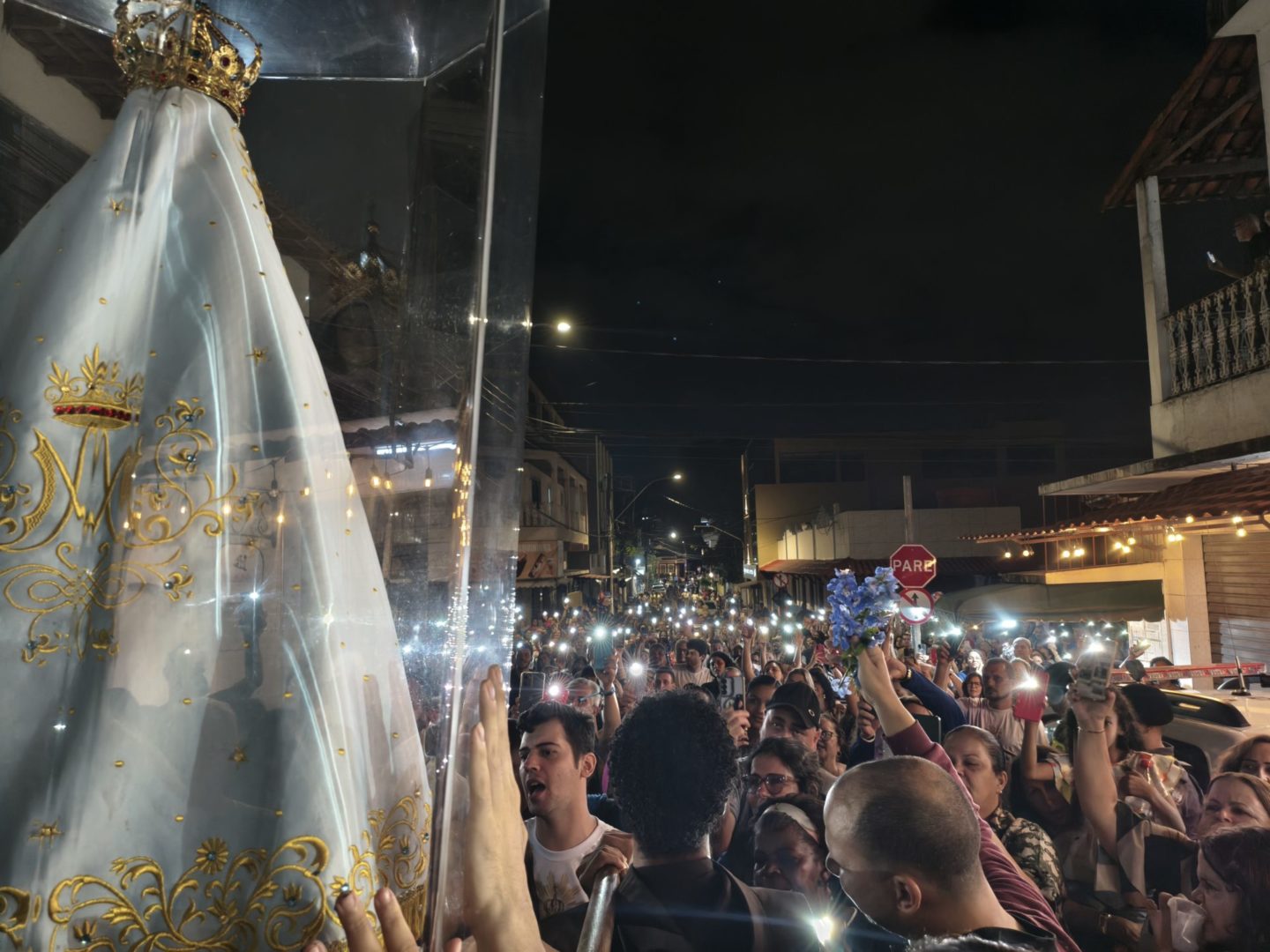 Por isso, olhando para a imagem de Nossa Senhora da Penha, eu vou convidar todos vocês para que fiquemos de pé e, empunhando os nossos celulares com as lanternas acesas, façamos deste momento uma forma de buscar a luz da paz na Virgem Maria.