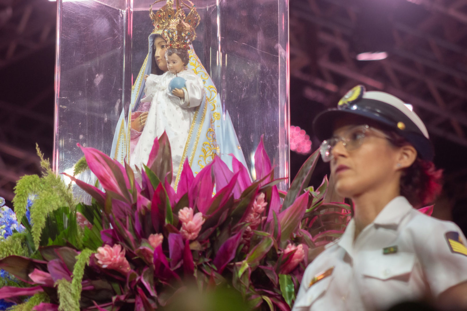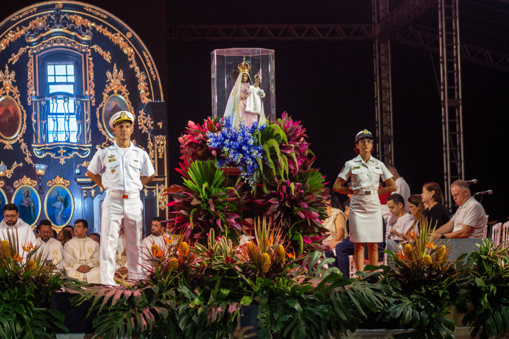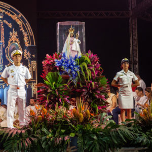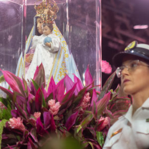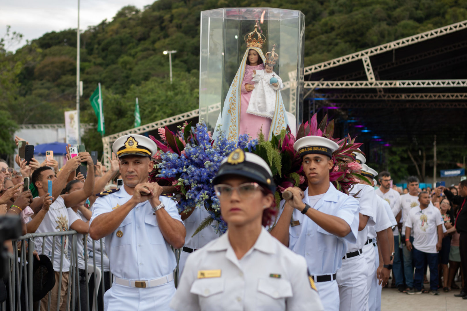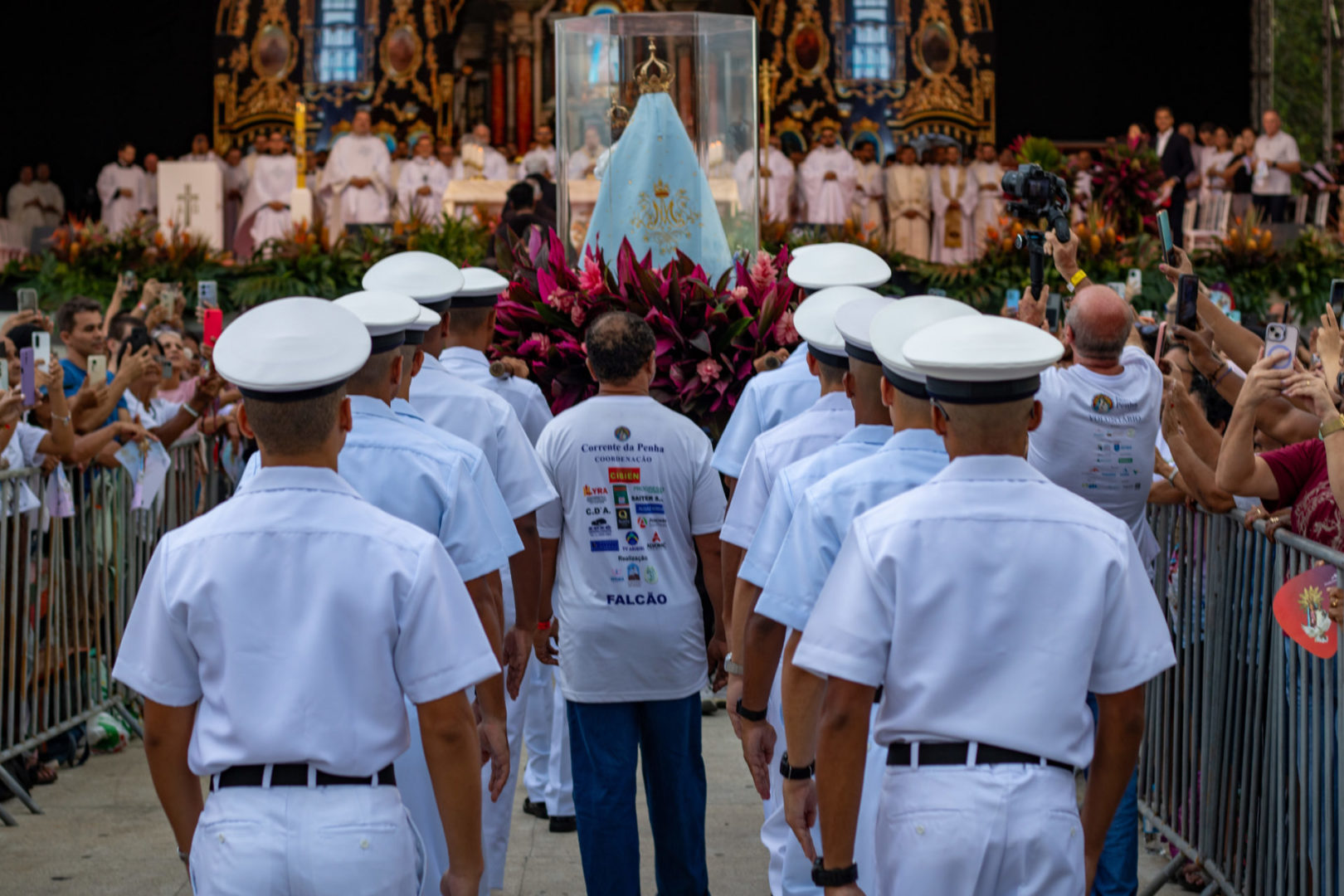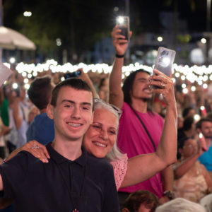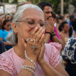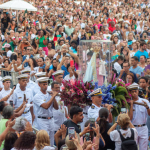 Por isso, olhando para a imagem de Nossa Senhora da Penha, eu vou convidar todos vocês para que fiquemos de pé e, empunhando os nossos celulares com as lanternas acesas, façamos deste momento uma forma de buscar a luz da paz na Virgem Maria.