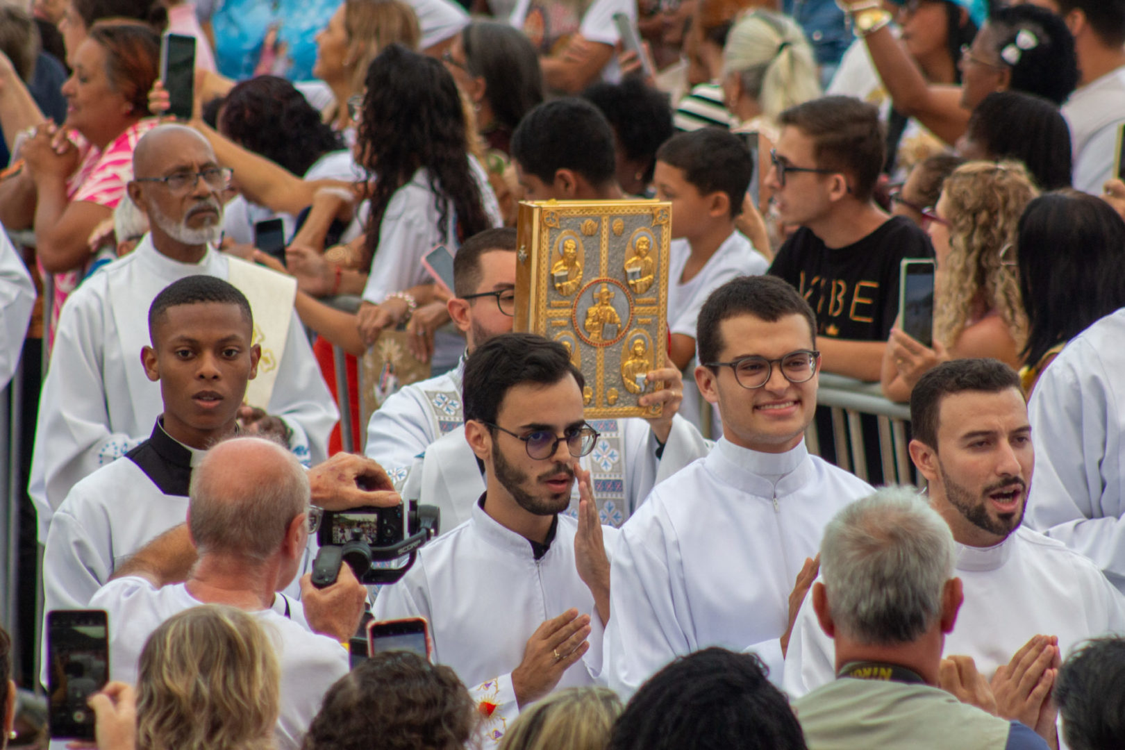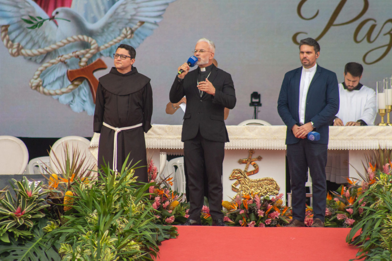 E esta festa é a festa da paz, é a resposta que Deus tem a nos dar ao nosso clamor de paz. Esta festa não caiu pronta do céu. Ela foi erguida em reuniões exigentes, em decisões difíceis, em renúncias silenciosas, em cansaços que ninguém viu, mas que Deus sabe. E, como disse o Papa Francisco, a paz é uma obra de artesãos. Vamos repetir? A paz é uma obra de artesãos.