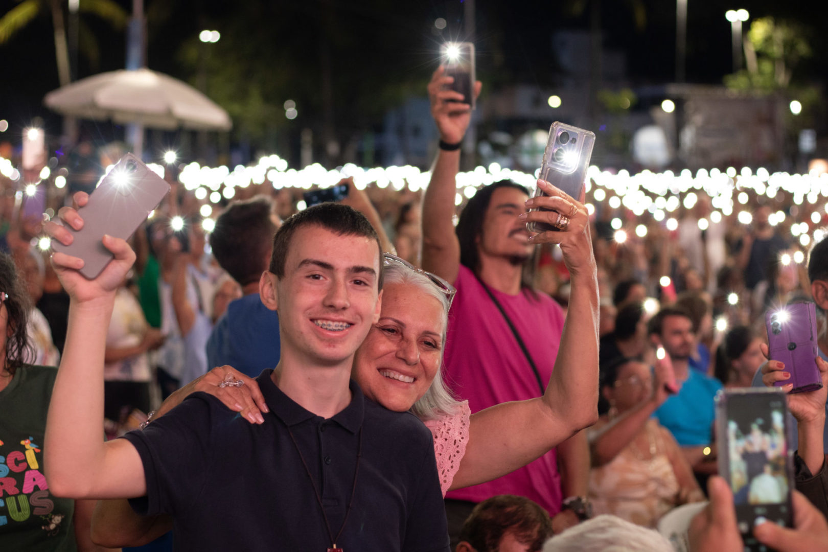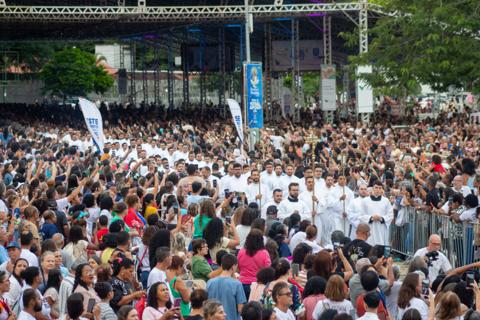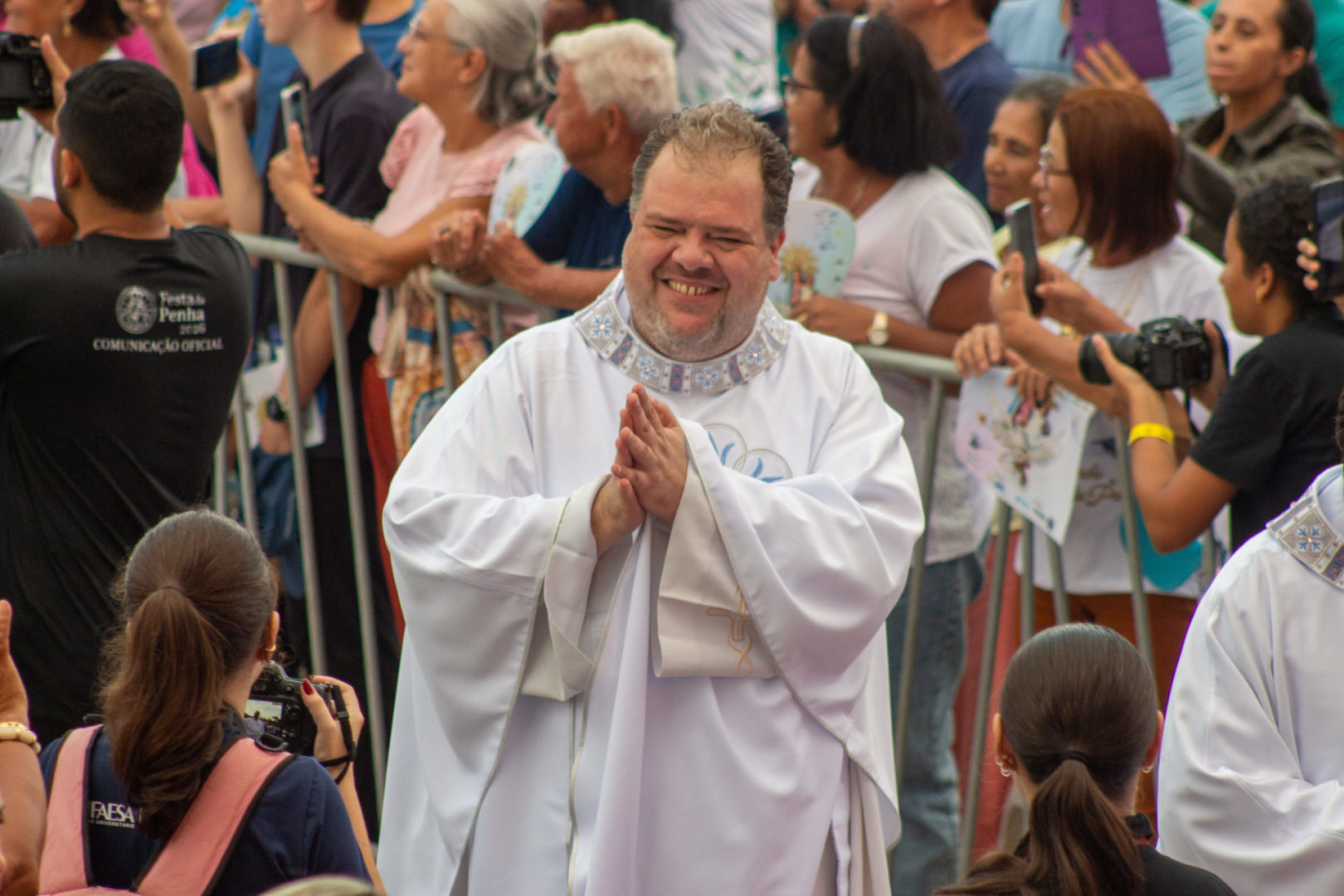 Citando todos esses artesãos, nós dizemos que a Festa da Penha 2026 é a festa da paz. Mas vamos parar aqui: acabou a festa, acabou a paz? Não. A paz não ficou presa aqui. Ela está no coração de todos aqueles que agora também se decidem ser artesãos da paz, construtores da paz. E esta não pode ser só mais uma festa. Que ela seja um marco, um divisor, um envio. E que cada um de nós volte para a sua realidade com a decisão clara, não de esperar a paz, mas de construí-la. Vocês não vieram aqui para sentir paz. Vieram aqui para se comprometer com ela. Por isso, eu gostaria de pedir que cada um agora pegue o seu celular e acenda a sua lanterna.