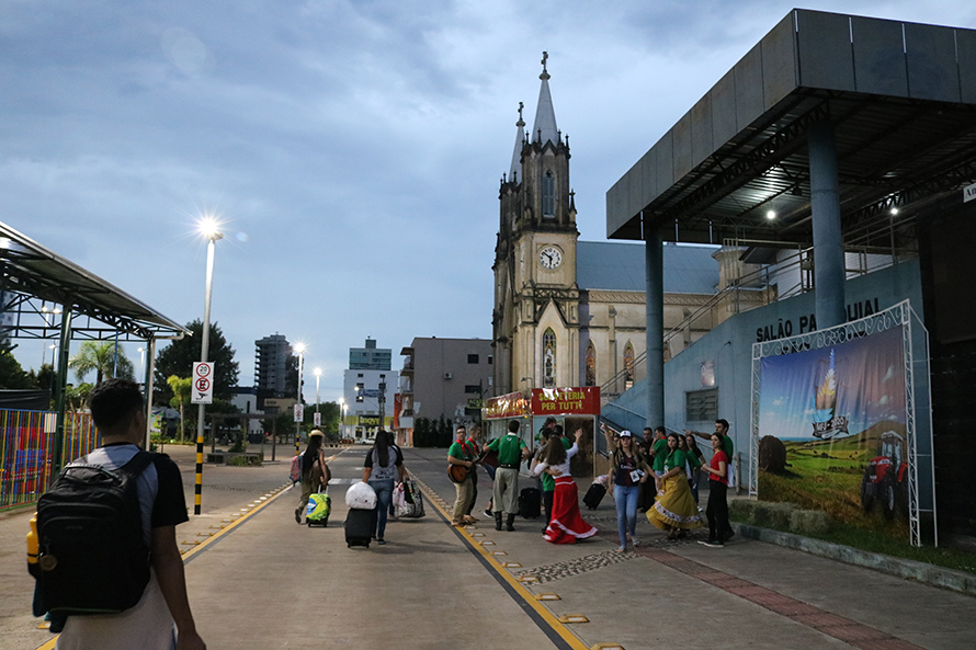 O ônibus trazendo os jovens da cidade catarinense de Lages (SC), foi o primeiro a chegar em Xaxim. Os jovens xaxienses, vestidos com trajes típicos da região, estão fazendo o acolhimento dos jovens.