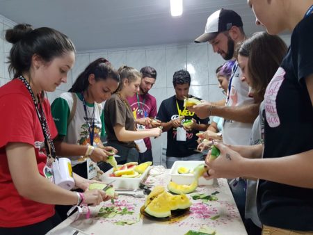 No final da tarde, os jovens que estão no Bairro Flor ajudaram a fazer um doce e criaram diversas paródias, recebendo a visita dos Freis Coordenadores da Missão.