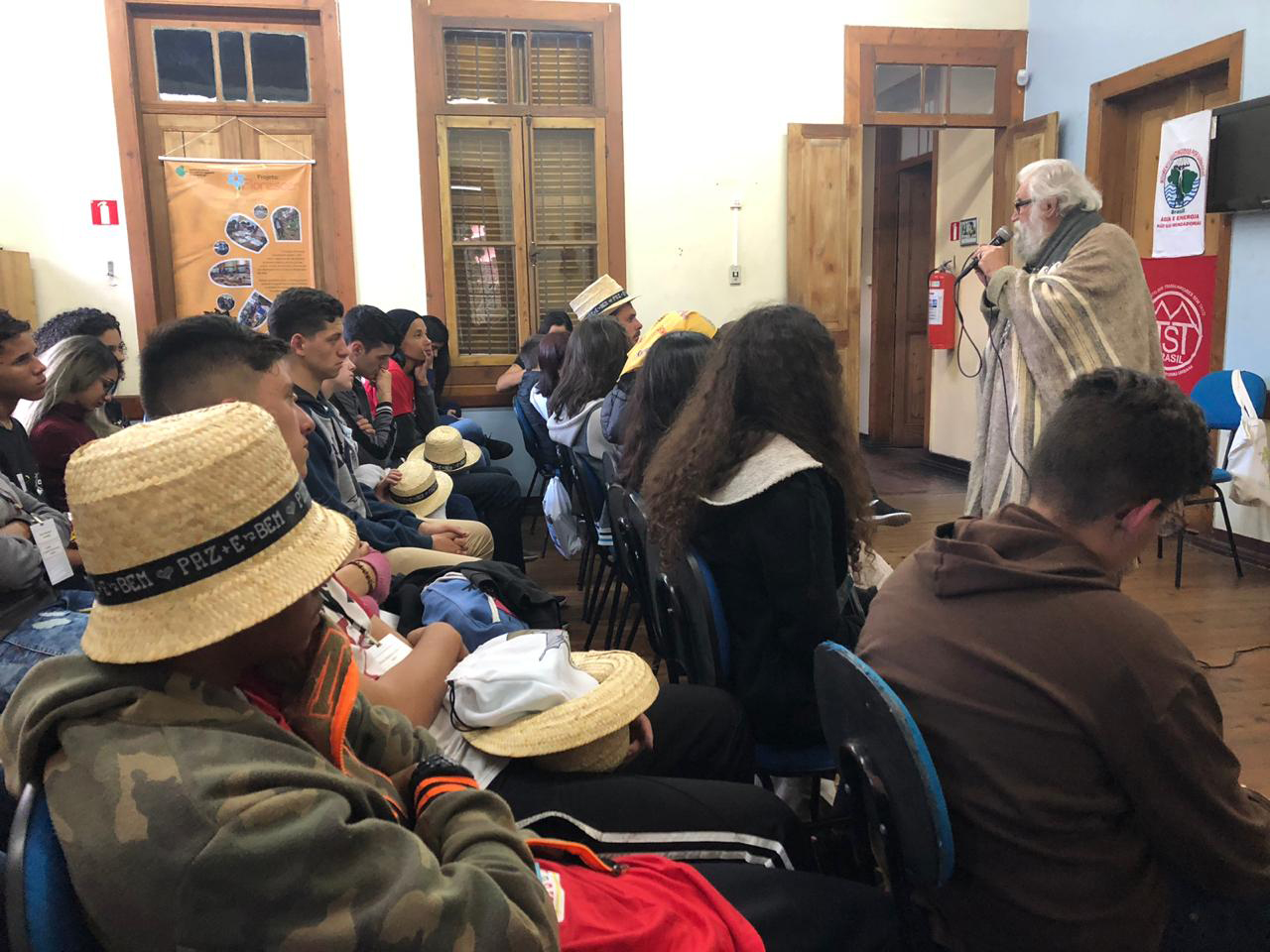O conhecido teólogo Leonardo Boff conversa com o missionários no Centro de Defesa dos Direitos Humanos de Petrópolis. Boff (1938) é escritor e professor brasileiro, um dos maiores representantes da Teologia da Libertação, corrente progressista da Igreja Católica.