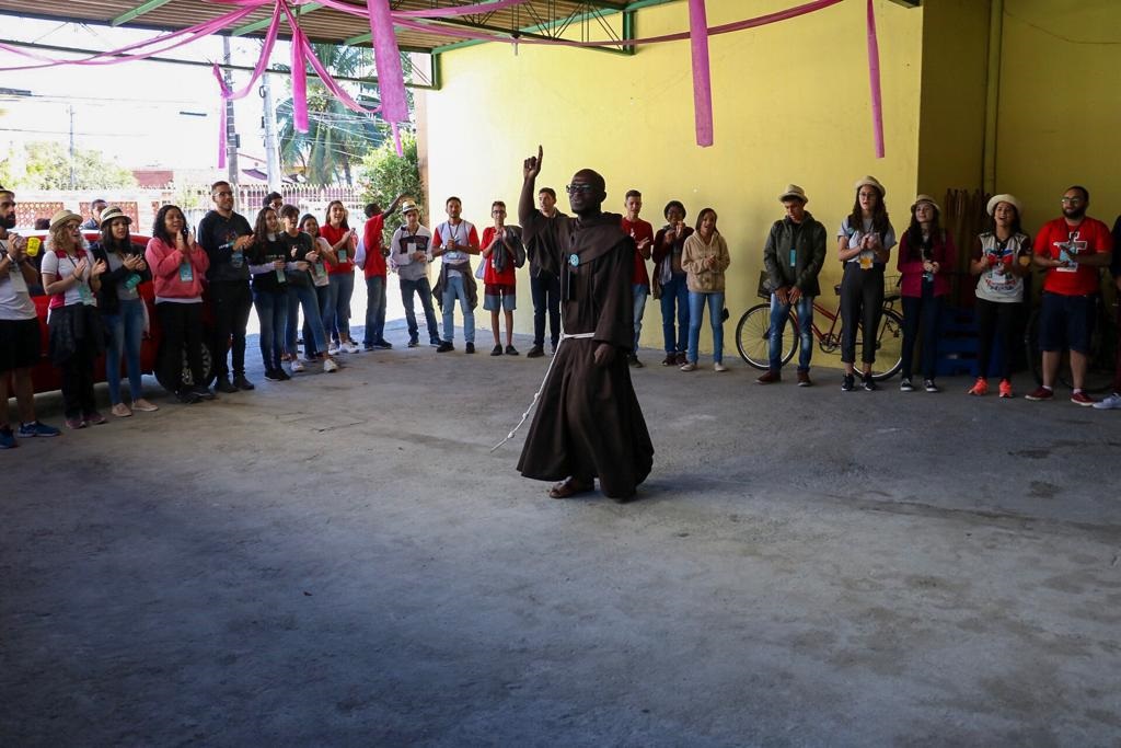 Após a Missa, no pátio da Paróquia, os jovens missionários se apresentaram de maneira bem angolana. Frei Alfredo orientou os jovens a cantar seus nomes, cidades e o fato de serem missionários.
