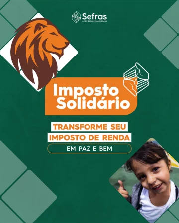 O Sefras – Ação Social Franciscana convida você a participar da campanha Imposto Solidário: transforme seu Imposto de Renda em paz e bem. Com esse gesto simples, parte do valor que já seria pago ao governo pode fortalecer iniciativas que acolhem e apoiam pessoas em situação de vulnerabilidade social.