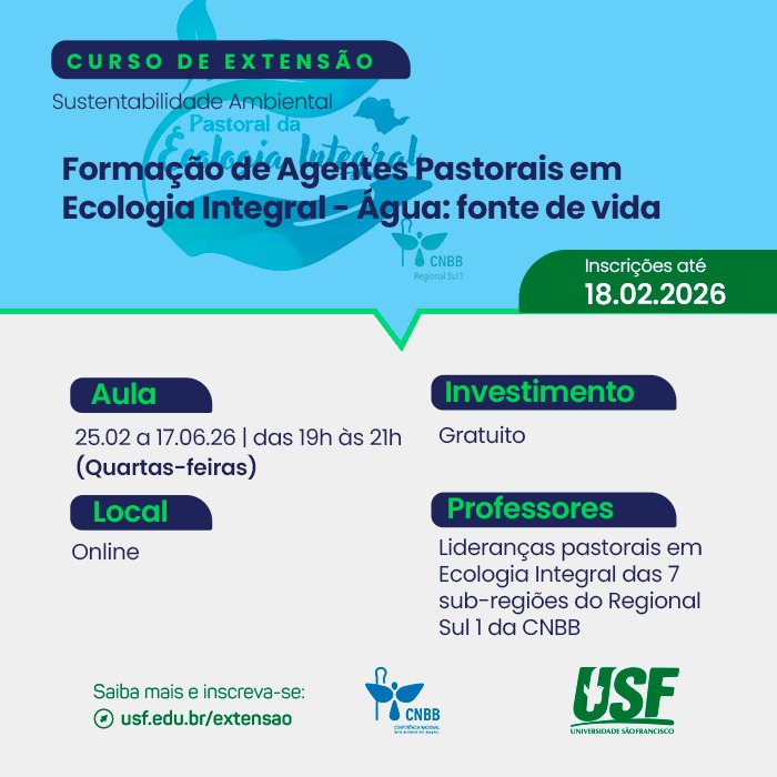 A Universidade São Francisco (USF) está com inscrições abertas para o curso de extensão “Formação de Agentes Pastorais em Ecologia Integral – Água: fonte de vida”, que será ofertado gratuitamente, na modalidade online, com início em 25 de fevereiro.