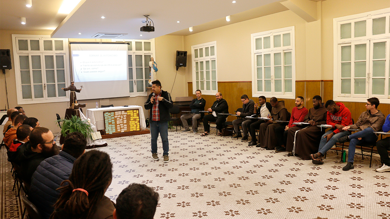 Ainda na parte da manhã, os frades participaram de uma formação conduzida por Wellington Heleno da Silva, especialista em psicoterapia psicanalítica. O tema trabalhado foi: “Um olhar para si: tornar-se autônomo”. Wellington abordou as potencialidades, as graças e os anseios próprios dos primeiros anos após a Profissão Solene, bem como os perigos e riscos desse período. Refletindo sobre a dimensão humana e psíquica, destacou a importância do processo pessoal de amadurecimento de cada frade no cuidado de si. A identidade do frade menor vai sendo moldada na vivência concreta das fraternidades e nos diversos serviços prestados à Província. Disse o psicólogo: