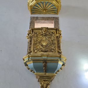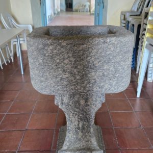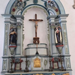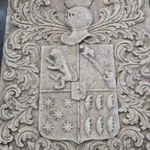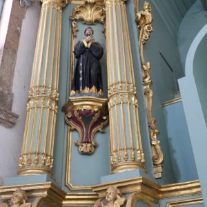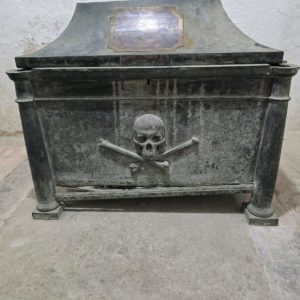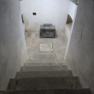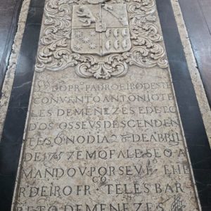 Logo abaixo do altar mór, na frente, no corredor central, há uma bela lápide, de pedra de lioz, onde consta o nome do filho da doadora, Antônio Teles de Menezes, que foi padroeiro do convento, mandado fazer por seu filho, Francisco Teles de Barreto de Menezes. No centro do corredor há uma cripta (catacumba), à qual é possível ter acesso erguendo-se uma porta de madeira. Interessante que é a única igreja da Província que tem esta construção. Esta cripta foi aterrada e cimentada na época da ocupação do convento pelos militares. Mas, não sabemos em que época, foi desaterrada e hoje é possível visitá-la. É constituída de três carneiros (sepulturas), uma no centro, e duas nas laterais. Nela guarda-se uma urna de metal com os ossos de duas mulheres, parentes dos doadores do terreno.