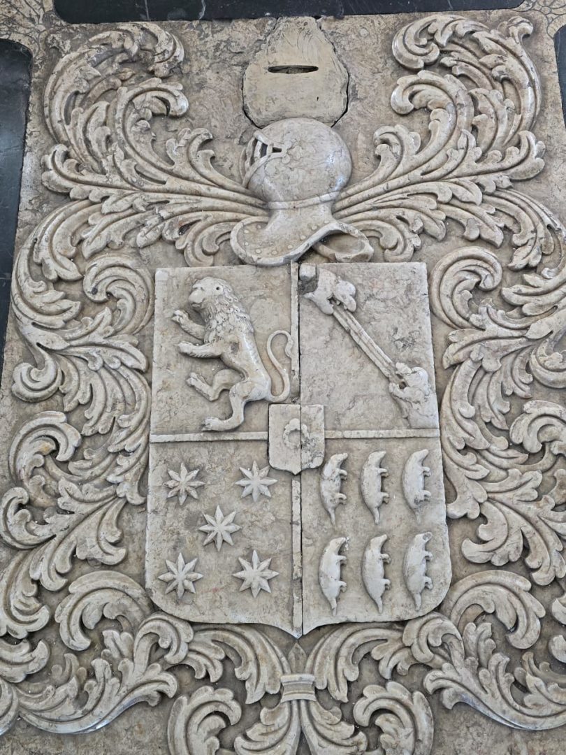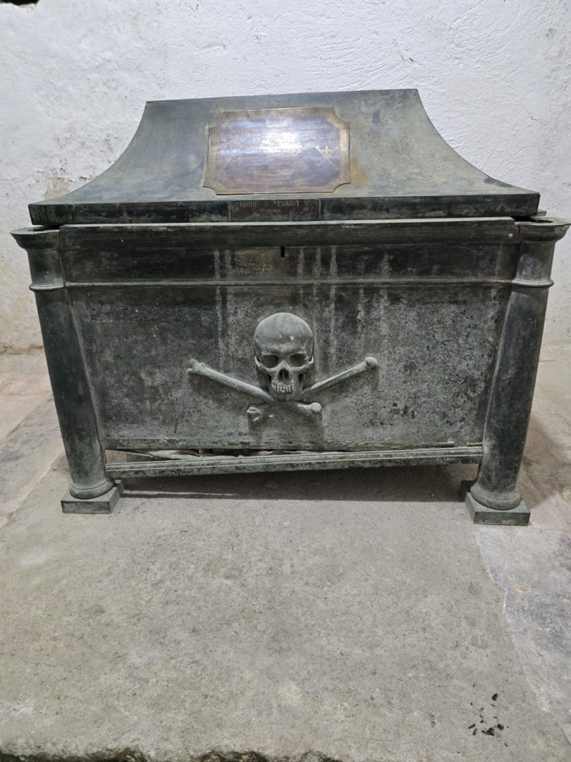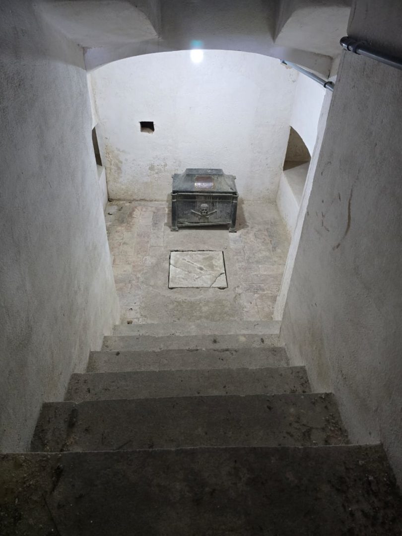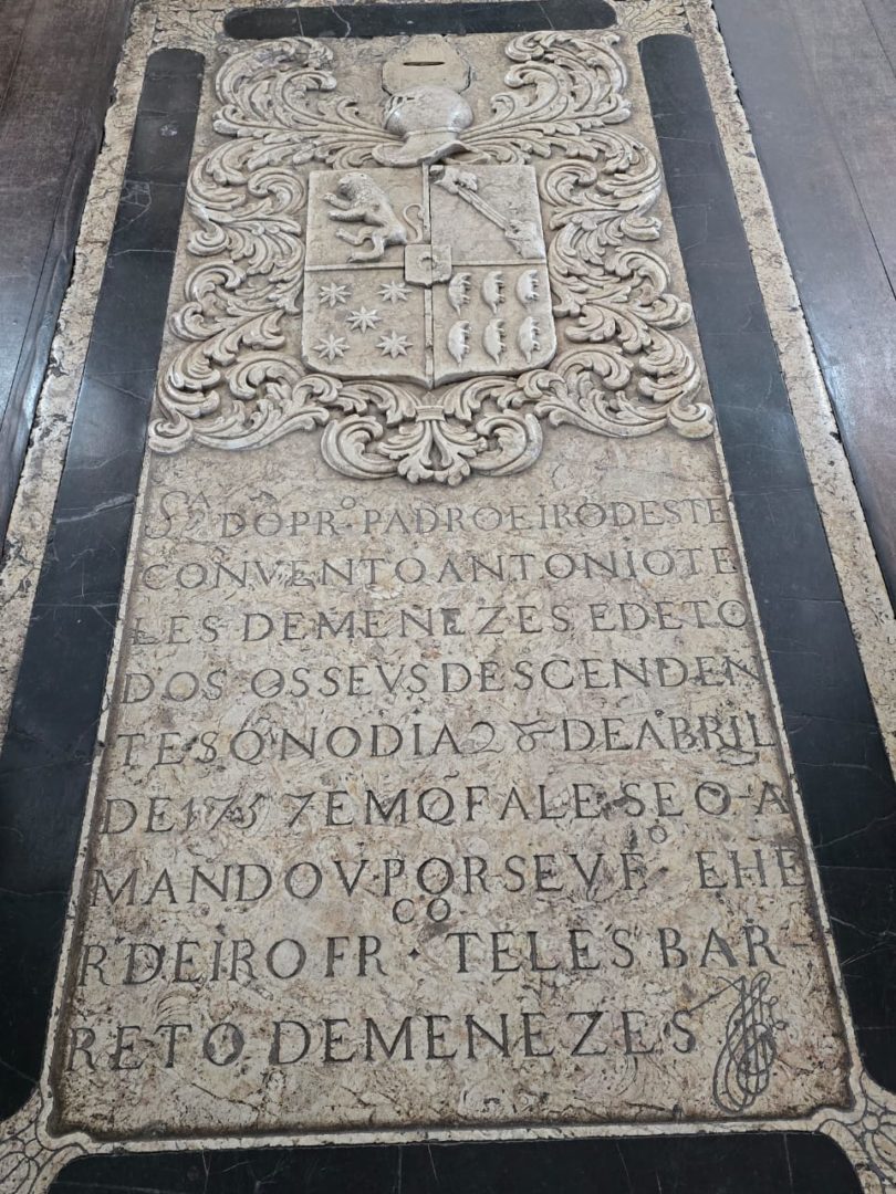 Logo abaixo do altar mór, na frente, no corredor central, há uma bela lápide, de pedra de lioz, onde consta o nome do filho da doadora, Antônio Teles de Menezes, que foi padroeiro do convento, mandado fazer por seu filho, Francisco Teles de Barreto de Menezes. No centro do corredor há uma cripta (catacumba), à qual é possível ter acesso erguendo-se uma porta de madeira. Interessante que é a única igreja da Província que tem esta construção. Esta cripta foi aterrada e cimentada na época da ocupação do convento pelos militares. Mas, não sabemos em que época, foi desaterrada e hoje é possível visitá-la. É constituída de três carneiros (sepulturas), uma no centro, e duas nas laterais. Nela guarda-se uma urna de metal com os ossos de duas mulheres, parentes dos doadores do terreno.